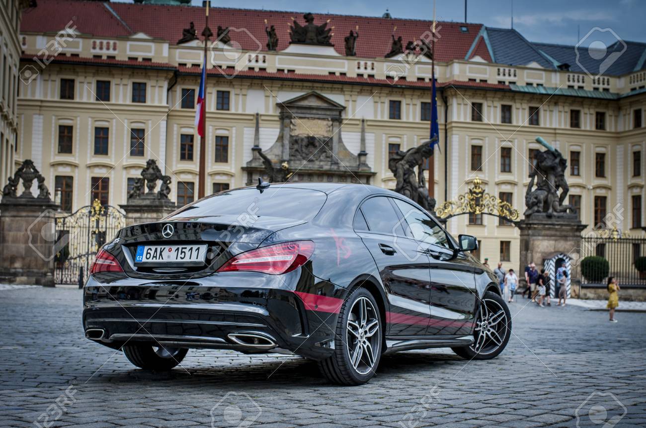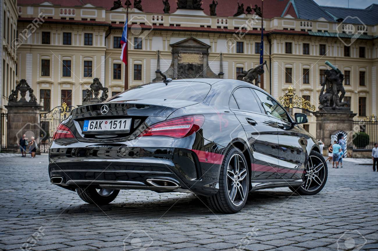 Prague Republique Tcheque 31 8 2017 Gros Plan De Mercedes Benz Cla 45 Amg Voiture Noire Avec Des Bandes De Sport Rouges Rare Vue De La Voiture Banque D Images Et Photos Libres De Droits